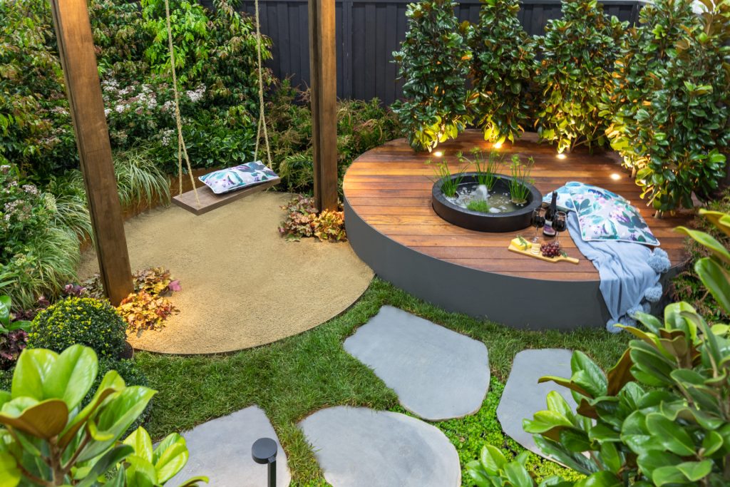 - Iluminación Escénica: Diseñamos el jardín para que también sea protagonista de noche, resaltando árboles y senderos.